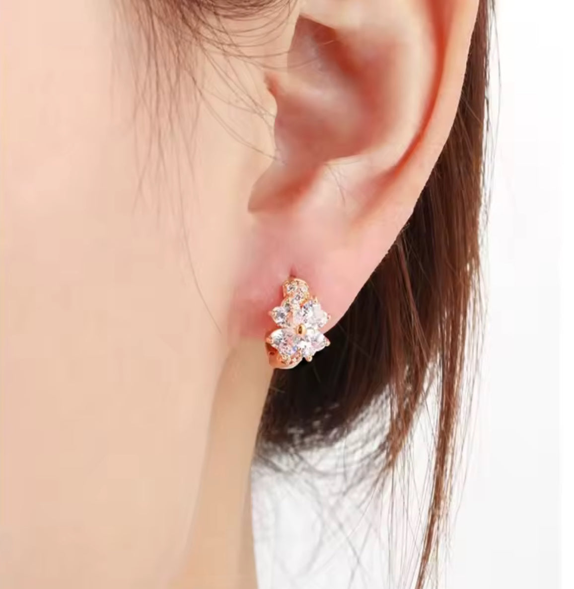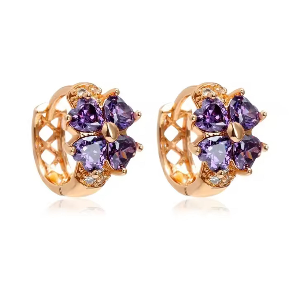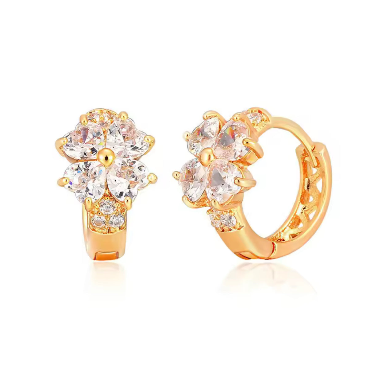 עגילי חישוק בציפוי זהב 18K עם עיטור פרח משובץ באבני זירקון נוצצות בגוון שקוף או צבעוני. העיצוב המשולב בין חישוק קלאסי לפרח עדין יוצר מראה יוקרתי ורך שמתאים לכל לוק – יומיומי או ערב.