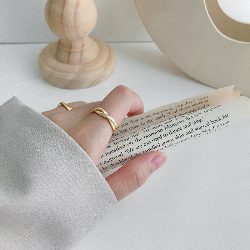 טבעת פתוחה בעיצוב שזור מודרני, עשויה מכסף סטרלינג 925 איכותי בציפוי רודיום או זהב צהוב 18 קראט.
