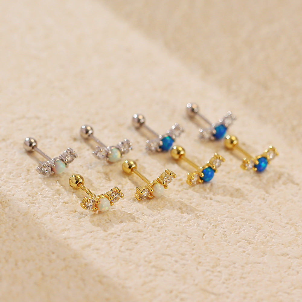 עגילי סטאד עגולים בעיצוב אלגנטי ונקי, משובצים באבן אופל טבעית בגוונים לבן או כחול, לצד נצנוץ עדין של זירקוניה AAA.