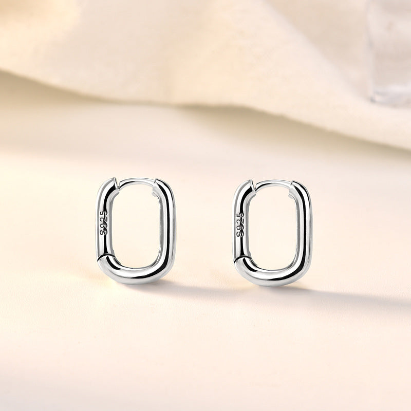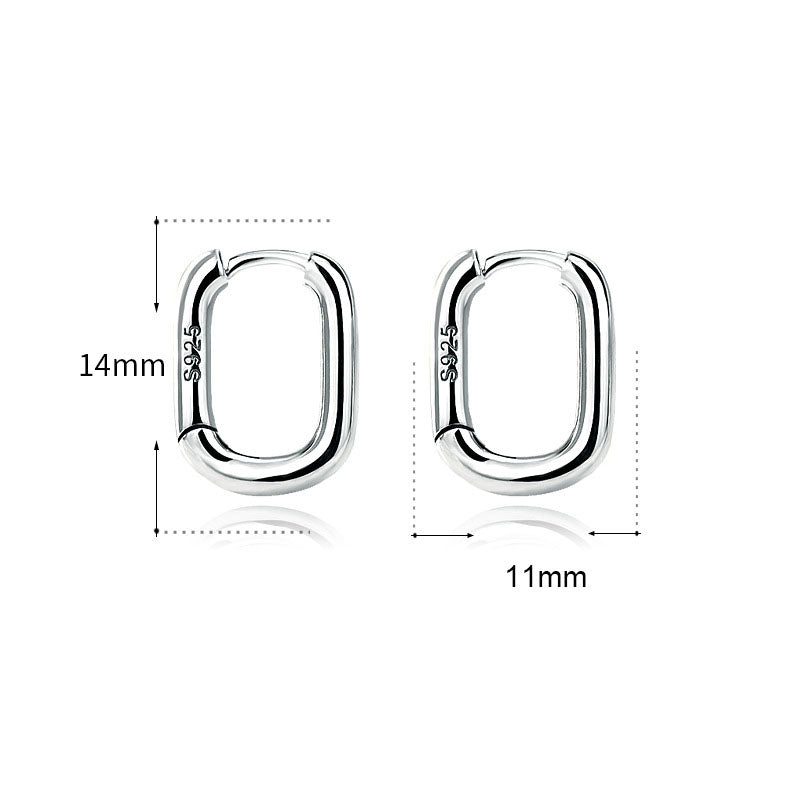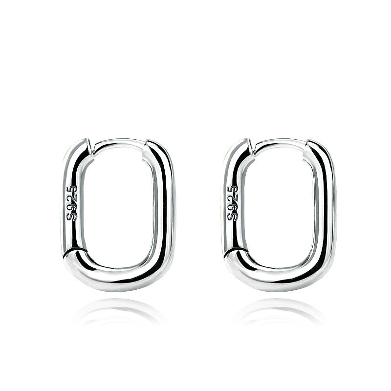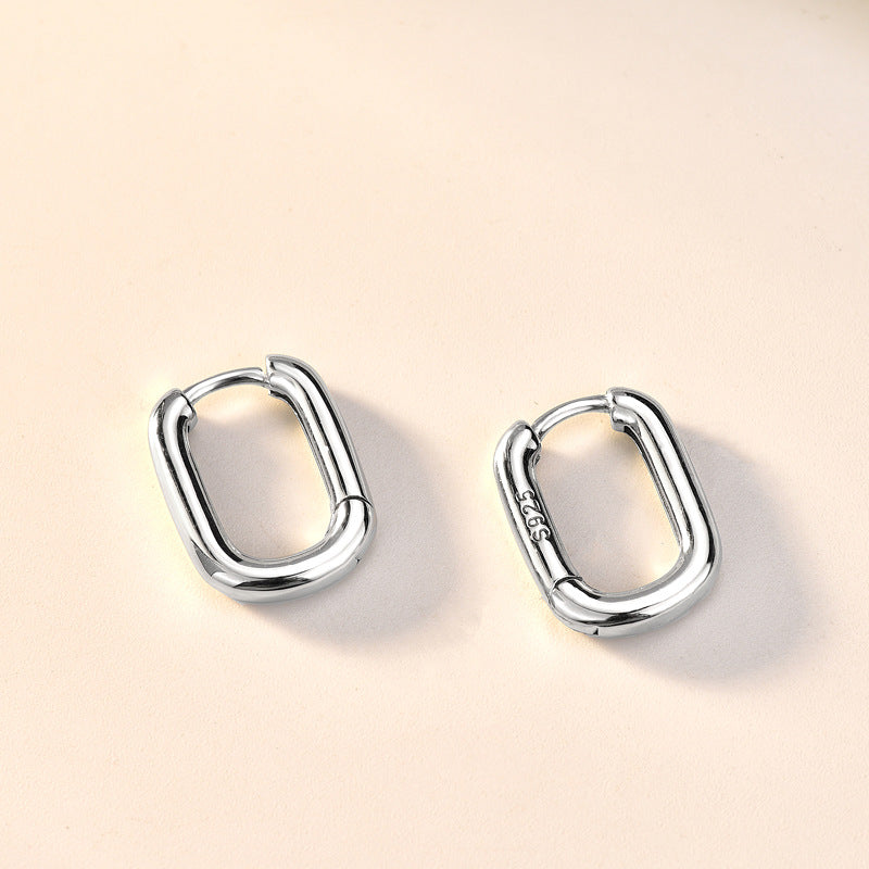עגילי חישוק בעיצוב מלבני חלול, בקווים נקיים ועדכניים, עשויים מכסף סטרלינג 925 עם ציפוי רודיום מבריק.