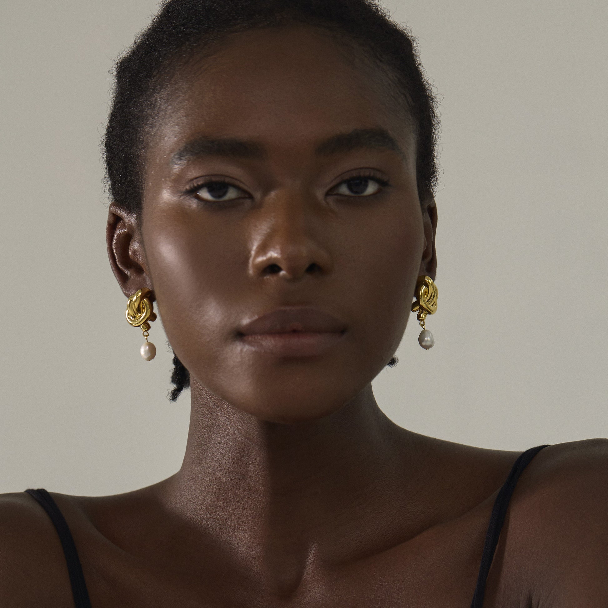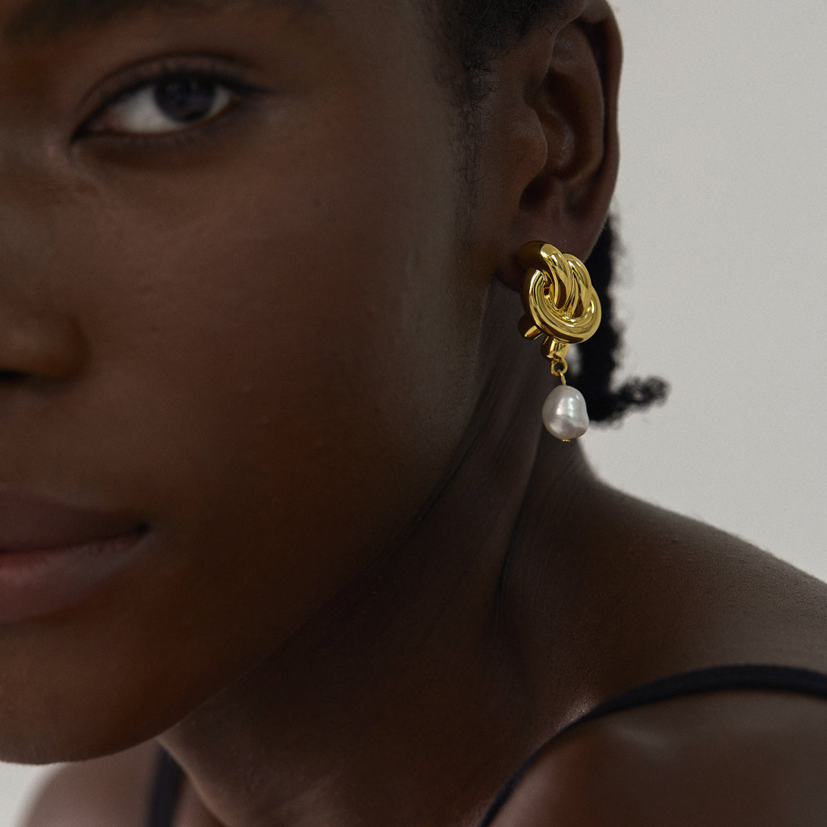 עגילים עם נוכחות שלא משאירה אף אחת אדישה – בעיצוב גאומטרי לא סימטרי המדמה קשר אומנותי, עם תליון פנינה עדין שמשלים את המראה.